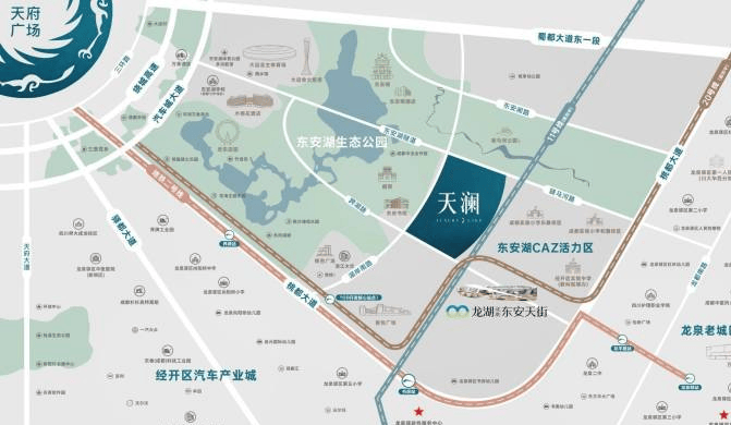 项目北揽5000亩东安湖生态,南拥龙泉驿区约20万方最大商业 综合体——龙湖东安天街+吾悦广场,兼具静谧生态与繁华商圈,汇聚东安湖最好的配套资源