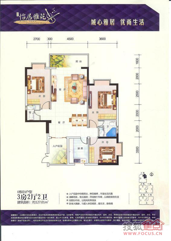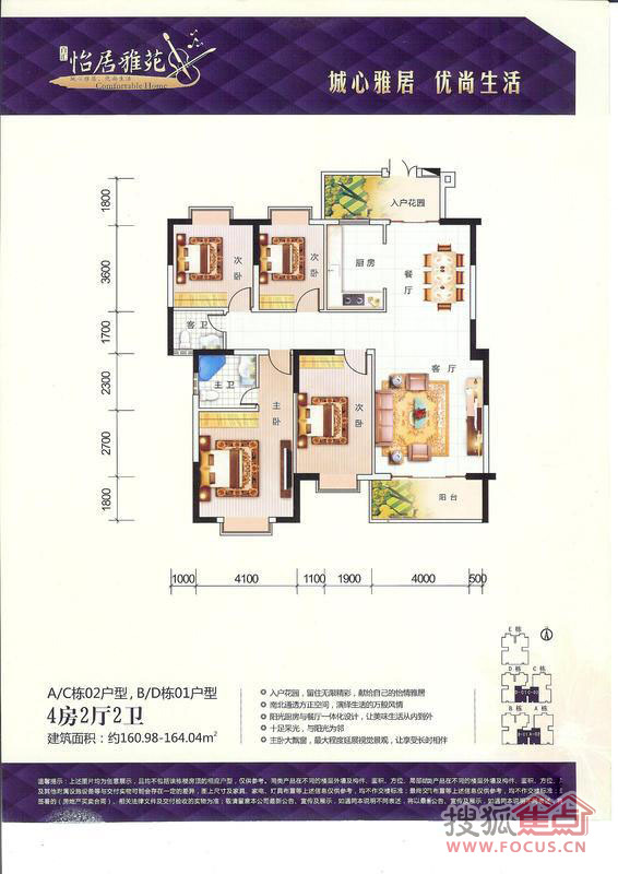 【怡居雅苑】由百汇地产实力打造;项目占地面积8474.21㎡,总建筑面积:79689.36㎡。由5栋29层的高层住宅组成,户型面积由121.59-131.73㎡的三房两厅及160.75㎡-165.87㎡四房两厅组成,共计504户。小区绿化率超过30%,倾力打造东南亚三重立体园林社区,内设酒店入户大堂、高品质架空娱乐会所、可视防盗系统、专业物管等多种品质设备,创造一个宜居的自然空间。 “出则繁华,入则桃源”--怡居雅苑,不仅给化州带来了一个自然清幽的“大雅门第”,更是开阔了化州人居的眼界,给城市带来了全新的期待和希望。
