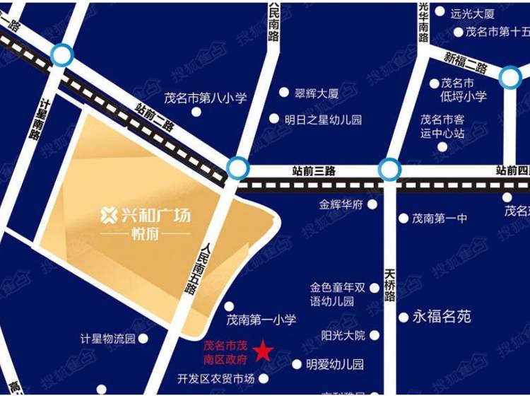 兴和广场毗邻茂名火车东站和计星物流广场,站南一街北侧,站前三路南侧。兴和广场是茂名排名前列真正意义上的大型城市综合体,占地面积44175平方米,建筑规模达30万平方米,总户数1094户,拥有约3000个停车位。兴和广场作为茂名茂南片区新经济增长点和新型住宅标杆,升值潜力无限。