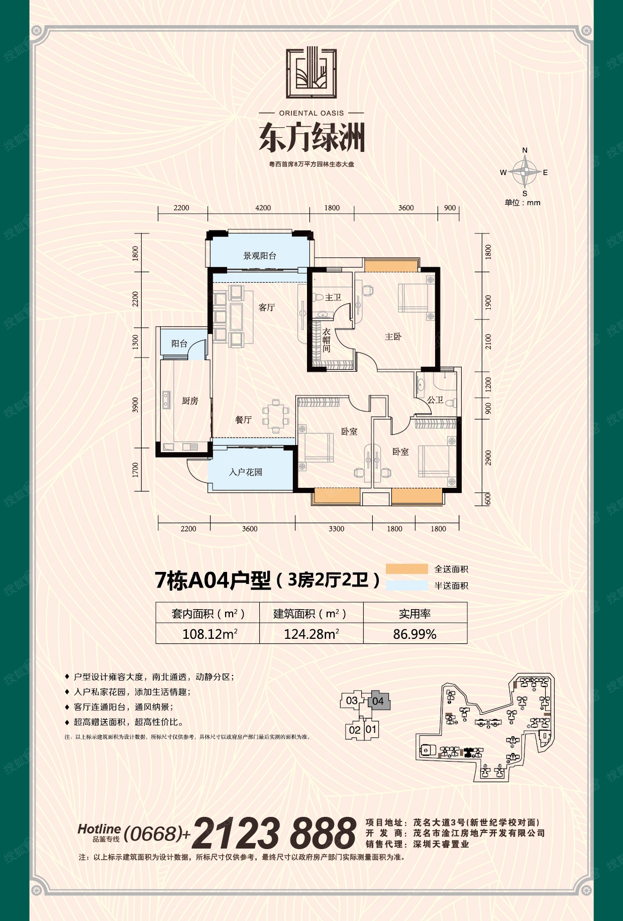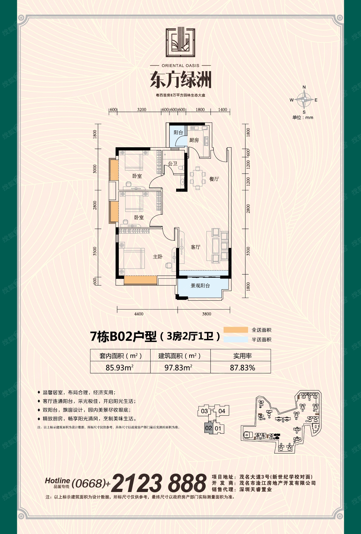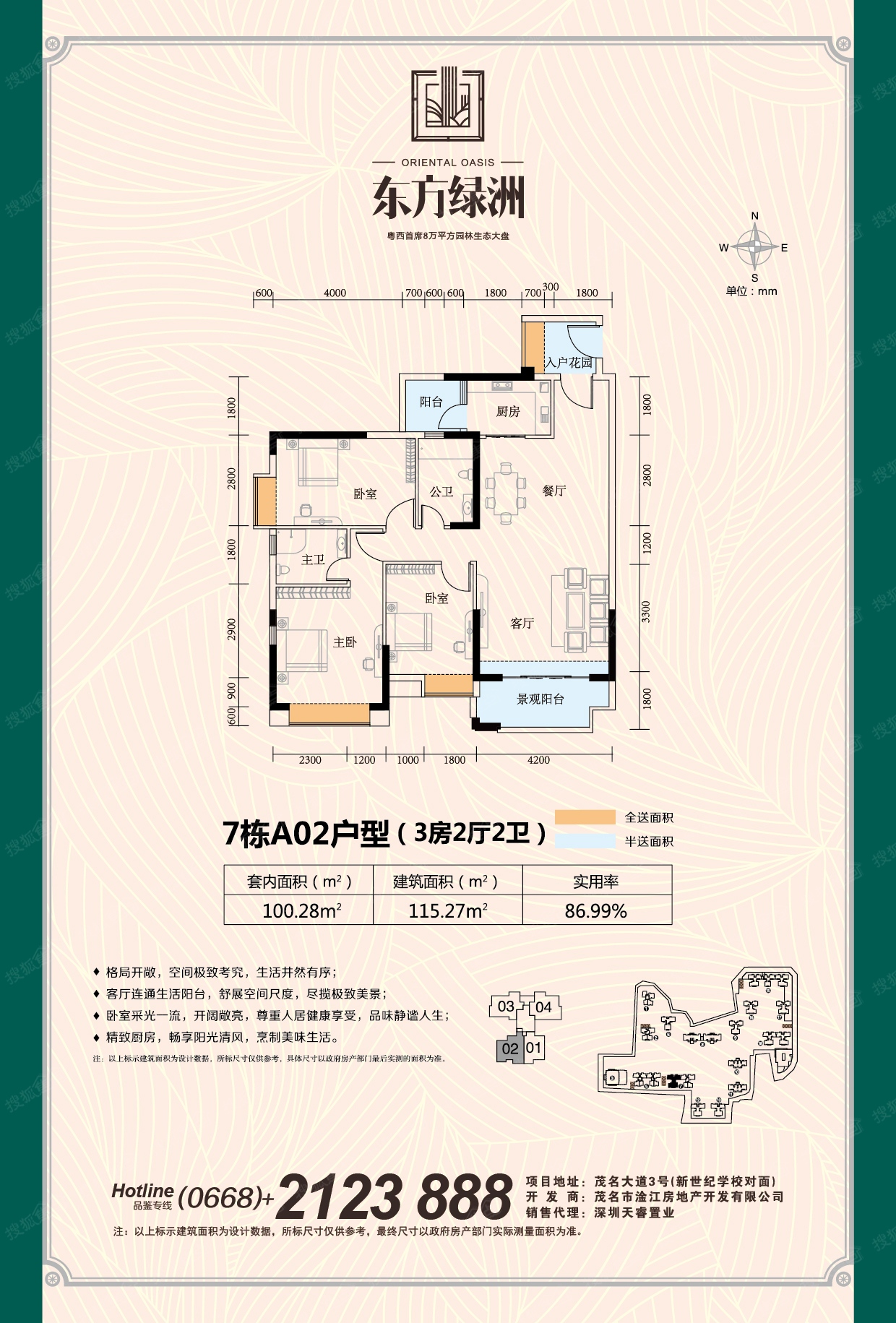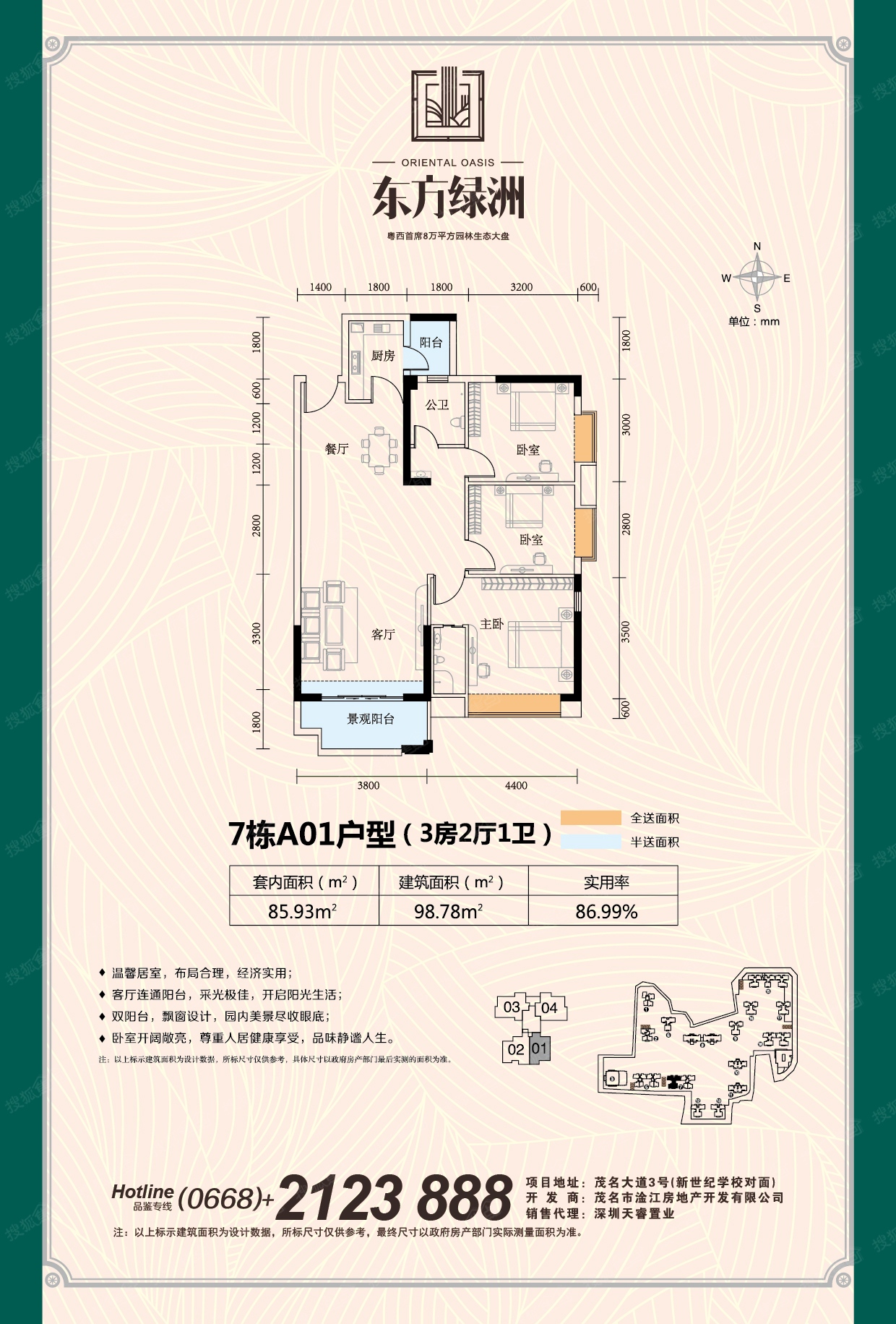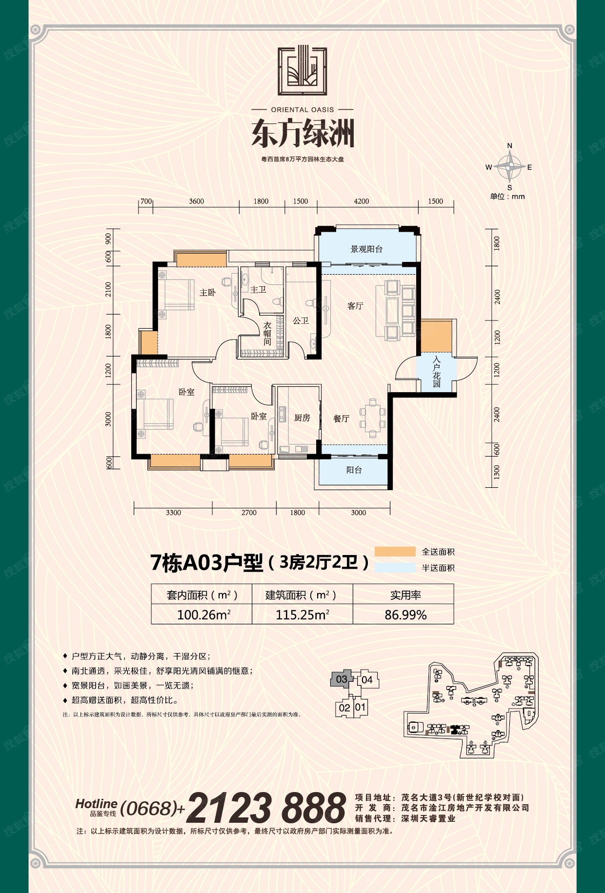 东方绿洲位于茂名大道3号(质监局南侧、新世纪学校对面),占地150亩,总建筑面积48万㎡。项目作为粤西首席8万㎡园林的生态大盘,我们坚持减少建筑落位、最大限度的拉阔楼距空间,享受160米超宽楼距,让生活景致在空中无限延伸,并在小区内设有1500㎡的活力大草坪、2000㎡的亲水景观湖、900㎡的无边界泳池,更有1.2公里的步行绿道、网球场、篮球场等等,让你真正感受到“家就在公园里“。