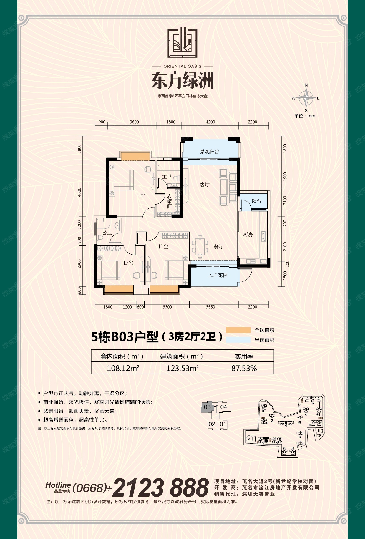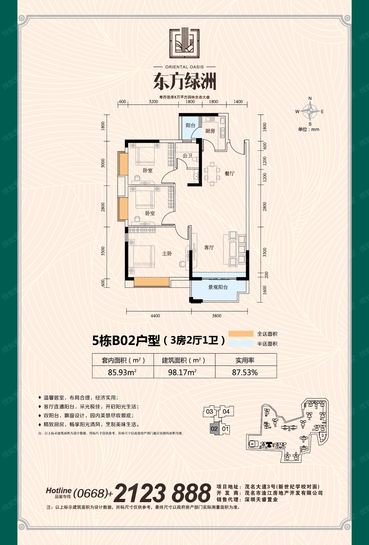 东方绿洲位于茂名大道3号(质监局南侧、新世纪学校对面),占地150亩,总建筑面积48万㎡。项目作为粤西首席8万㎡园林的生态大盘,我们坚持减少建筑落位、较大限度的拉阔楼距空间,享受160米超宽楼距,让生活景致在空中无限延伸,并在小区内设有1500㎡的活力大草坪、2000㎡的亲水景观湖、900㎡的无边界泳池,更有1.2公里的步行绿道、网球场、篮球场等等,让你真正感受到“家就在公园里“。