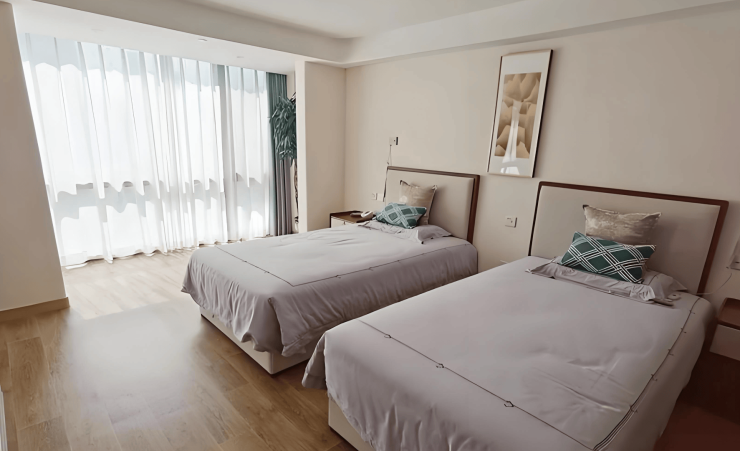 坐落于北京西二环核心区北礼士路98号的大家的家阜成城心社区,总占地面积2.75万平方米,绿化覆盖率达35%,形成“医疗+生态”双重资源环绕的独特优势。社区采用新中式外立面设计,灰砖黛瓦与胡同街景自然融合,中央庭院复刻四合院天井结构,种植银杏、海棠等20余种植物,屋顶花园年产金银花、薄荷等药用植物超600公斤,PM2.5浓度常年低于30μg/m³,负氧离子含量达市区均值3倍。居住单元配备防滑地胶、双层扶手、智能护理床及毫米波雷达跌倒预警装置,单人间28-40㎡、双人间40-50㎡、家庭套间含开放式厨房,每间均配置电动护理床、智能马桶及可视化猫眼,构建“安全、适老、健康、智慧”的安居环境。