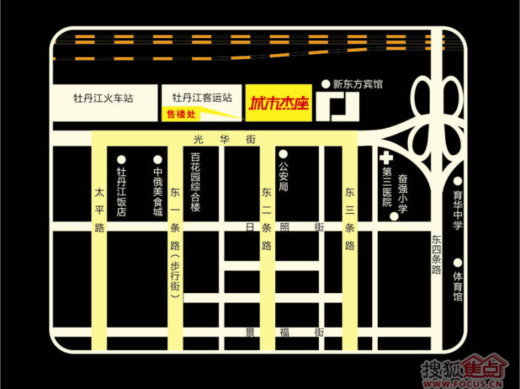 牡丹江城市杰座位于东二条路光华街道北、哈尔滨银行旁边,紧邻东一步行街,牡丹江火车站,交通便捷,多路公交车站点
