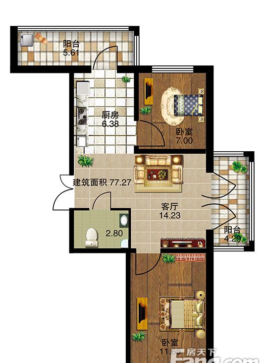 2室1厅1卫-2室1厅1卫户型77.27㎡