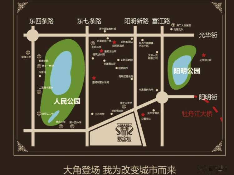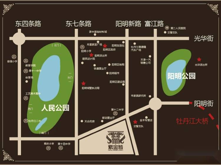 项目位于阳明区的城市景观中轴线东平安街南侧,东临阳明新路,南靠牡丹江,北依阳明区建设局与牡丹江市第十二中学。交通十分便利,区域内拥有多条公交线路,10、13线以及301、302环线公交车10分钟左右皆可到达牡丹江市中心。周边配套成熟,阳明区政府、公园(人民公园、阳明公园)、多家医疗机构(二院分院、肛肠医院)、银行、中小学校(十二中、十四中、阳明小学、照庆小学)、超市遍布在项目周边,生活工作都非常方便。“紫金城”处于人民公园与阳明公园之间,在拥有多处自然景观的同时也是不可多得的城市天然氧吧。是清晨晨练、夜晚散步的较佳休闲场所。