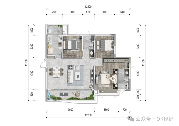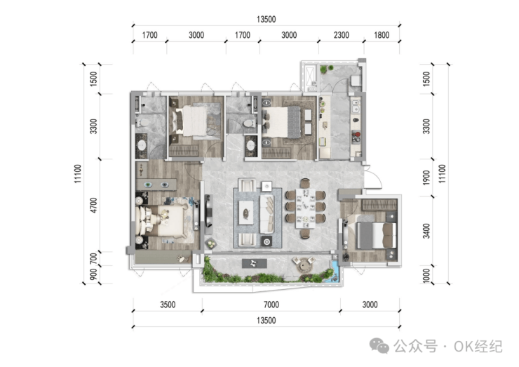 建面约115㎡洋房、套三双卫