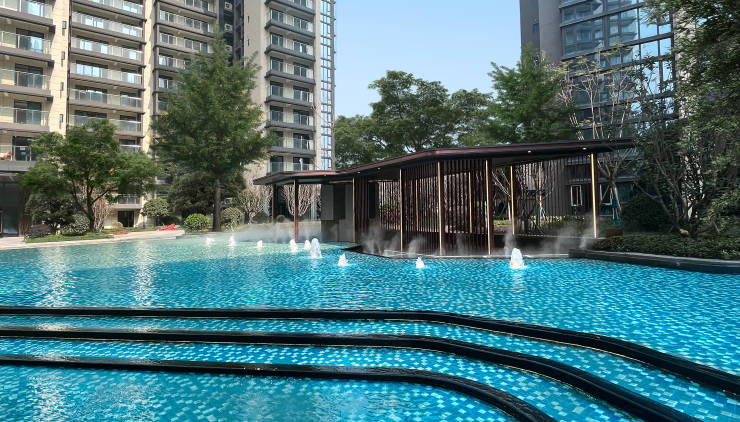 小区园林景观以“森居岛岸”为设计思路,将森林、岛屿感引入日常生活中,弱化景观与建筑的边界,增强人与环境、环境与生活的互动感。中庭铺陈大面积水景,水中艺术雕饰作品时尚典雅,沿岸花木高低错落,营造新加坡滨海式园林景观,移步异景,诗意弥漫。