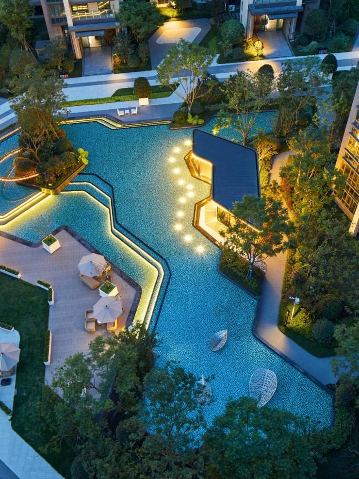 项目以新加坡式的滨海城市现代风格为根基,流线型极简艺术线条呈现水韵律动之美。大面积玻璃幕墙映射园内水景,光影流转,虚实有致,LOW-E玻璃的配置,简约不失实用性。