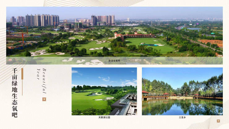 天然氧吧,卧龙谷公园、白鹭湾湿地公园、三圣乡花乡、天鹅湖湿地公园(1200亩)等生态资源