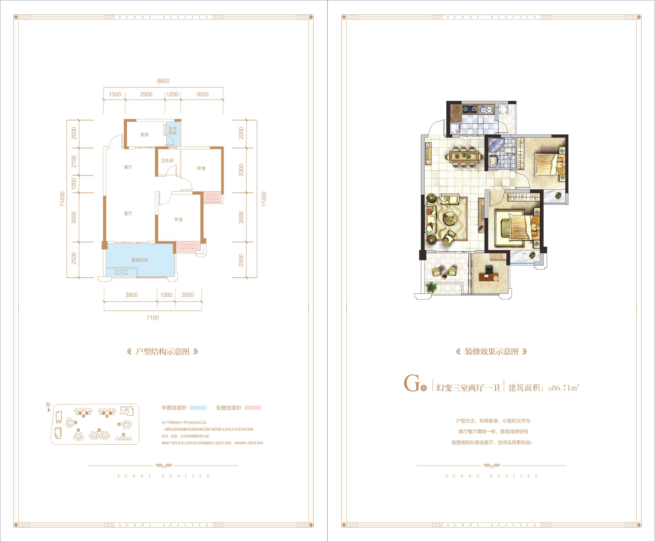 “阳光西雅图”地处绵阳高新腹地——火炬大厦片区。区域集政务中心、教育中心、区域商业中心、居住中心、交通中心五大中心为一体。逐步形成绵阳高尚居住生活区。 项目北临火炬南路、南接虹苑路、东连双碑西路、西接火炬东路。周边路网发达,交通便捷,10车程能够顺利到达城市中心。高新区经历10来年的开发,城市特征明显,配套较为成熟,土地的稀缺性地段,蕴藏了阳光西雅图巨大的价值潜力。 “阳光西雅图”项目总占地面积约138亩,规划总建筑面积约43万平方米,容积率为3.61,绿地率为30%,建筑密度为30%,规划总户数为2908户,车位3000个。规划幼儿园建筑面积1800平方米,风情商业街面积约为6万平方米,满足项目自身配套的同时,也势必将成为绵阳的又一个高尚人居的标杆。 项目设计中始终坚持“继承与突破”的规划思想,设计手法统一和谐。项目定位于43万平方米新青年时尚生活商住综合体,经典的ART-DECO建筑风格优质演绎、俊朗的建筑立面、流畅的天际线、简洁大气。6万平方米的商业采用独栋式商业与商业裙房的相结合形式,其独特的造型,灵活的布局、精致的细部处理,引领着整体楼盘的品质和商业氛围。届时,影院、餐饮、休闲、娱乐、购物等时尚生活元素应有尽有。27.2万平方米精品华宅,采用点板结合的方式,均南北向布置,景观中轴将南北两区有机串联,使整个设计充满灵动感。在户型设计上,均做到了明厨明卫,良好的采光通风,动静分布,干湿分区等。50-125平方米灵动生活空间,满足刚需、首改、投资、经营等多方面需求。同时项目经过3-5年的开发,项目将成为科技绵阳又一人居新天地。