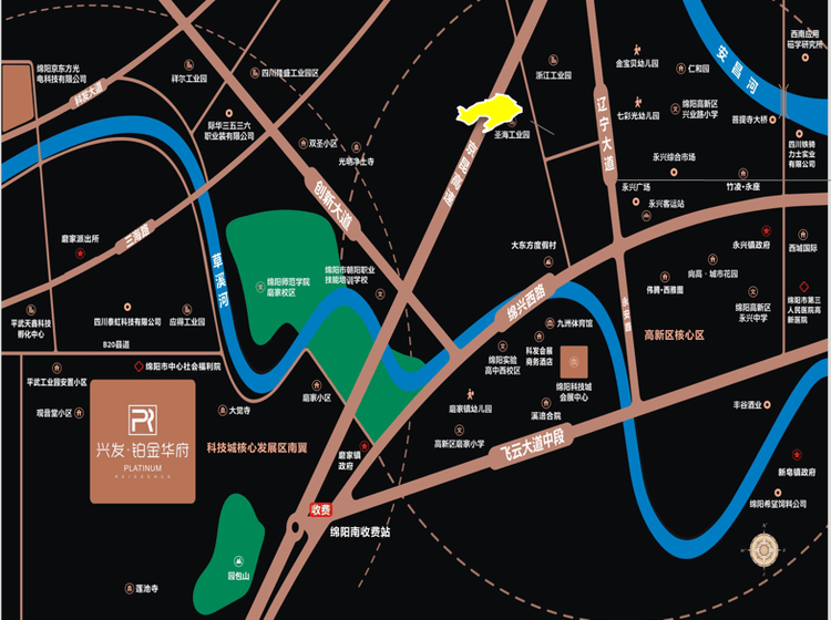 兴发·铂金华府是由兴事发集团全资子公司——四川兴发房地产开发有限公司投资开发。项目占地74.15亩,位于科技城集中发展区南翼的绵阳高新区新平大道上(绵阳磨家师范学院旁),紧邻成绵高速,距离市中心15KM左右,周边道路四通八达,不管是餐饮娱乐休闲购物,还是商务往来生活教育,一切都十分便利。随着科技城集中发展区的迅速发展,以京东方和汽车产业园为主发展电子信息、汽车制造和新材料等产业,将打造成为一个集科研中心、文化体育中心、商业商务中心和国际交流中心于一体的国际化现代化的绵阳城市新中心。今后这里不仅是高新技术产业的聚集地,更是城西CBD核心区,而兴发.铂金华府就处于未来城市新中心的中央,居住或投资前景都是其他地区无法比拟的。