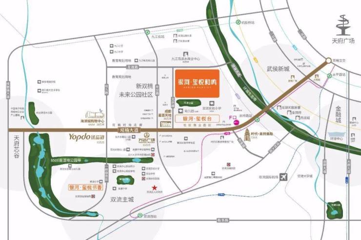 银河·玺悦和鸣位于双流东升板块,双楠大道以北。作为武侯大道在绕城外的延伸段,双楠大道其实是一条贯穿成都西南方向的主干轴,在此大道沿线分别诞生了双楠、外双楠、武侯新城和新双楠。而银河·玺悦和鸣,就属于新双楠板块。