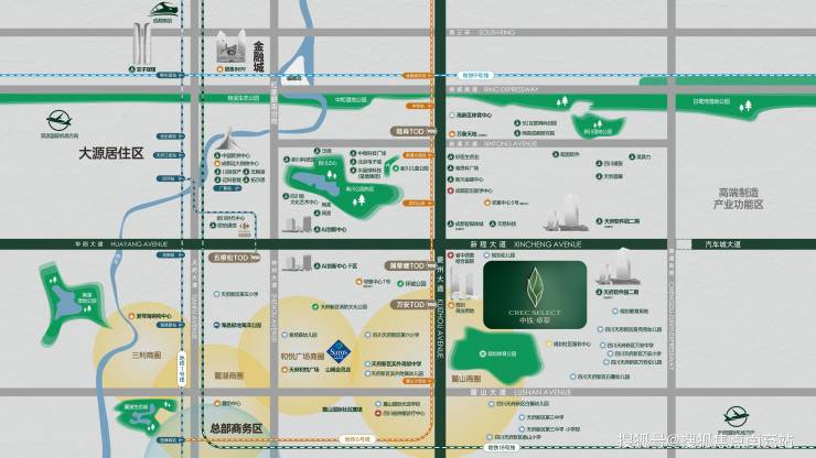 公园:约 865 亩新川之心中央公园、约 16.7 万㎡新川环城公园、应龙湾郊野公园、约46.8万㎡天府新区法务岛公园、规划体育公园在侧。