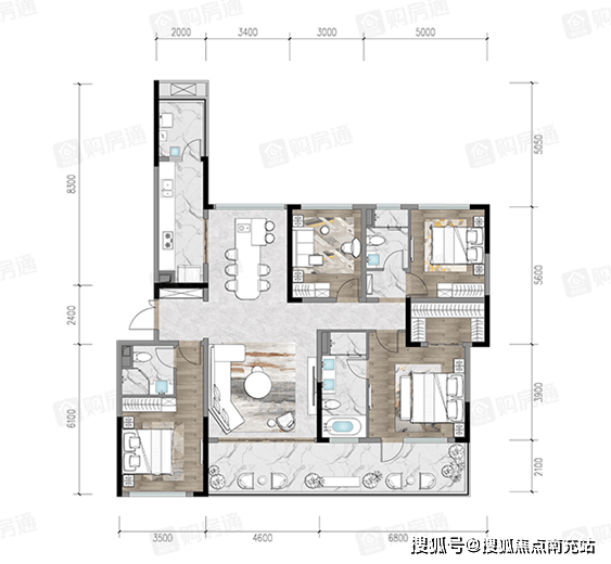 比较特别的是,该户型并没有采用一般大平层流行的大横厅,而是坚持西派比较常用的客餐厅分离设计。