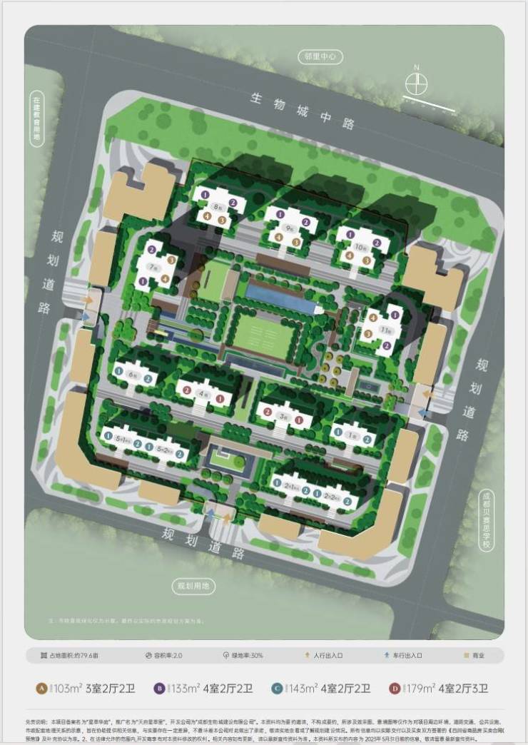 教育:幼儿园:项目周边规划 2 所公立幼儿园,紧邻已开学的生物城第一幼儿园(公办),步行 10 分钟可达;小学 / 中学:划片范围内涵盖生物城实验学校(九年一贯制公办,已开学)、成都天府中学(K12 民办名校,车程 10 分钟),教育资源优质且充足,全龄教育无忧。