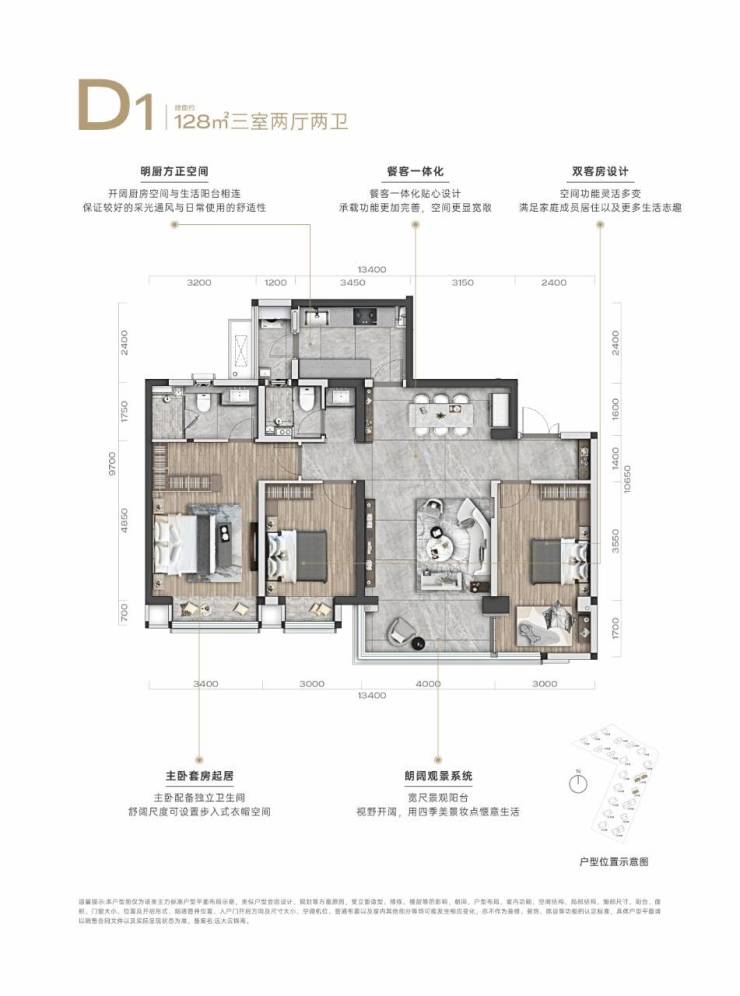 建面约128平套三
