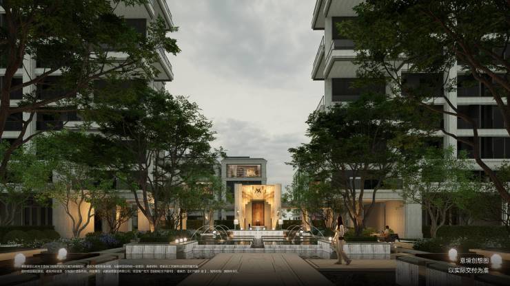 顶奢酒店式度假园林:复刻亚特兰大瑞吉经典元素,提取摩洛哥安缦珍纳标志性水轴,奢石与水系融合,营造殿堂级漂浮水苑。