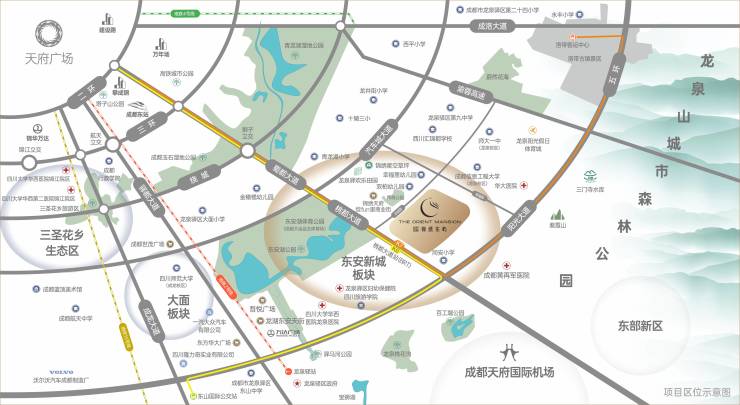交通:蜀都大道,双向14车道、内设BRT快速通道。5分钟可直达大运会主场观、东安湖、青龙湖、龙泉山等多个休闲旅游景点;8分钟直达成都绕城高速。