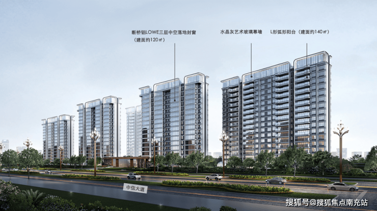 外立面采用三项高端配置:1. 飞翼造型屋顶搭配水晶灰艺术玻璃幕墙2. 高窗墙比设计辅以金属格栅及弧形铝板装饰3. 沿街楼栋标配价值数万元的三层中空玻璃封窗