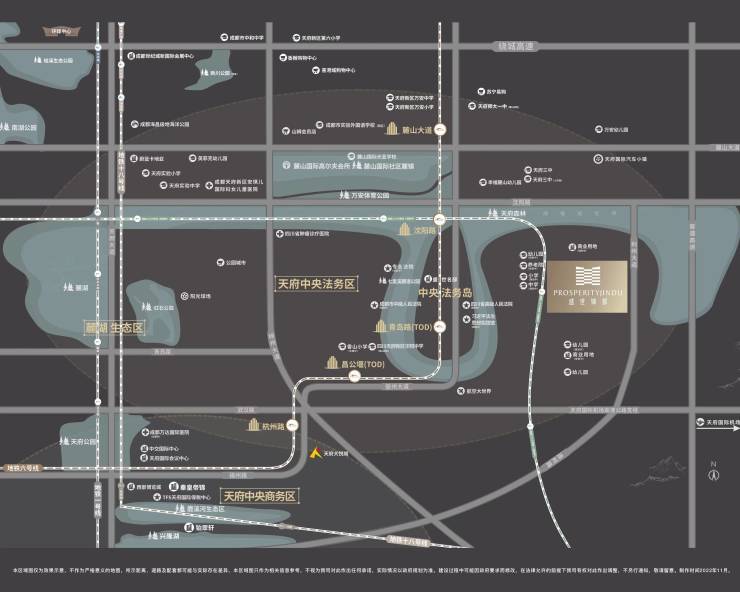 盛世锦都地理位置优越,位于天府前湾板块,这一区域连接高新区和天府新区,是城市发展的核心地带。项目周边交通路网密集,包括三横三纵的路网结构,如麓山大道、沈阳路、武汉路等主干道,以及利州大道、蓉遵高速、夔州大道等纵向通道,自驾出行十分便捷。公共交通方面,项目距离地铁6号线青岛路站仅1.5公里,未来还将有26号线规划通过,出行无忧。