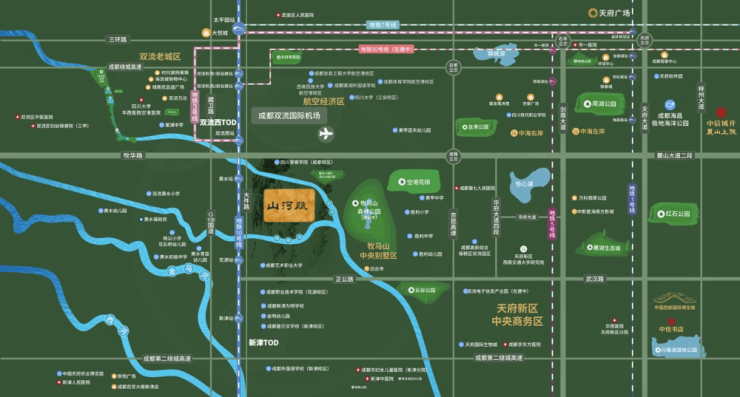 山河赋位于城南天府新区和双流区交界的板块,属于成都南拓重地,享受天府新区产业发展带来的城市机遇和双流空港经济的枢纽优势。