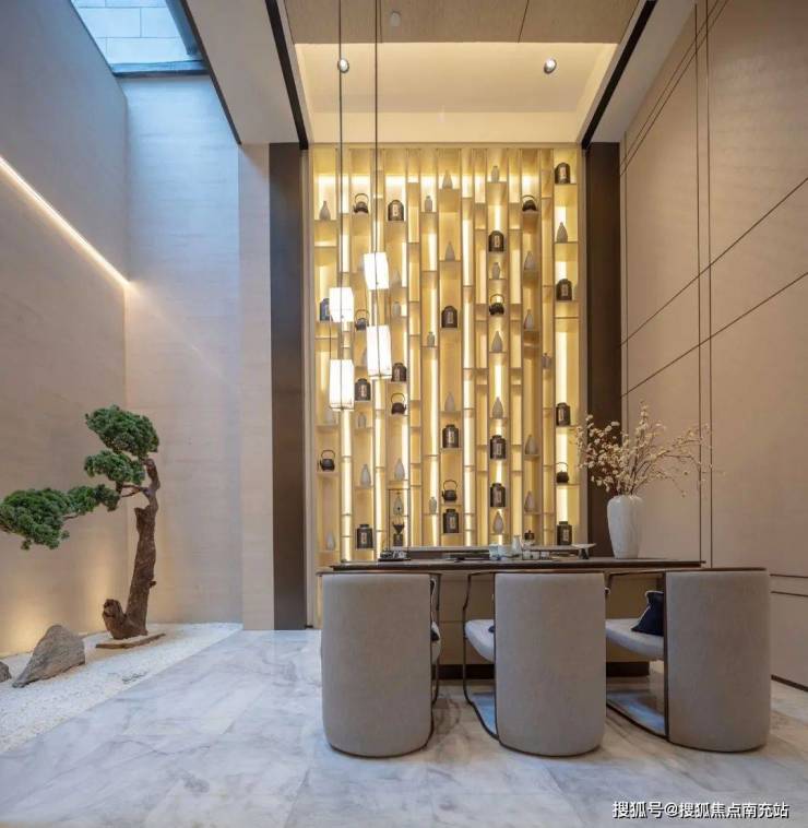 风格方面采用的是新中式风契合景观园林想表达的川西民居院落感,外立面是浅黄色石材和深咖色金属为主,外挂石材是给你做到顶了的!