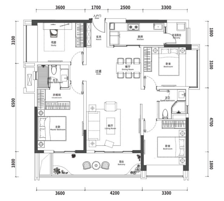 建面约 141㎡的 H2户型,为四室两厅两卫格局
