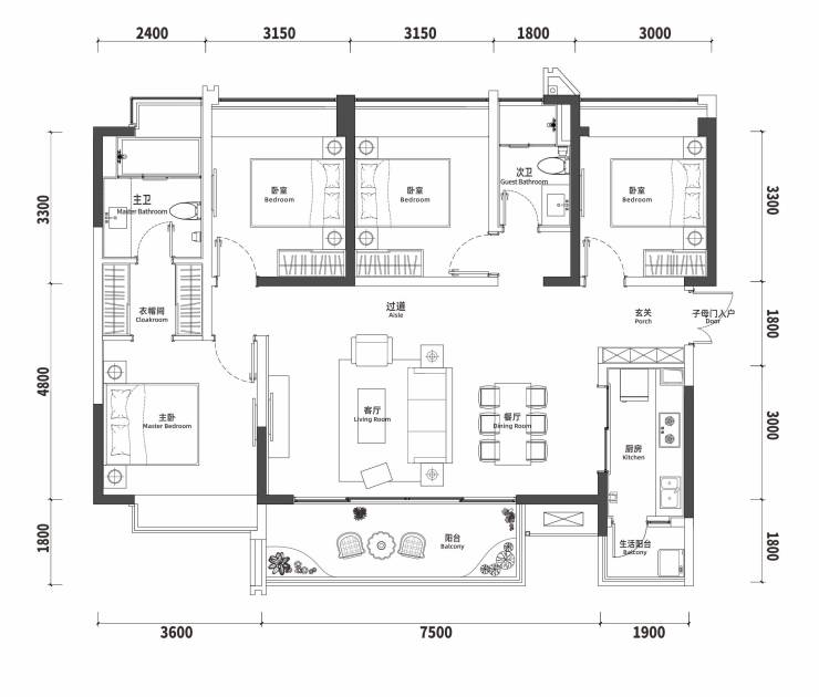 建面约142㎡户型:四室两厅两卫