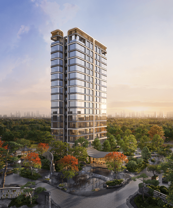 建筑风格:以宋式雅韵为魂,外立面采用仿石漆、香槟金矩管与双层中空 Low-E 玻璃,点缀楠木饰面、琉璃瓦等细节,兼具现代质感与古典韵味。