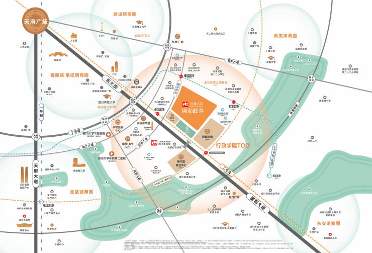 项目雄踞龙泉驿区东三环行政学院TOD核心区,地处城市发展黄金走廊。周边交通网络四通八达,地铁2号线、9号线、30号线三轨交汇,5站直达金融城CBD,6站连通攀成钢商圈,10站直抵春熙路商圈。驿都大道、绕城高速、成龙大道等城市主干道构建起立体交通体系,实现全城高效通达。
