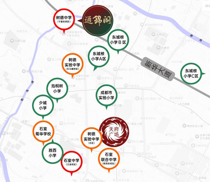 1. 学区资源顶尖:归属青羊二区优质学区,周边有泡桐树小学、东城根街小学等顶尖小学,初中对口树德实验中学(东马棚校区)等“三小联中”,还邻近树德中学宁夏街校区等四七九本部相关校区,能覆盖从小学到高中的优质教育链条,是学区房中的热门选择。