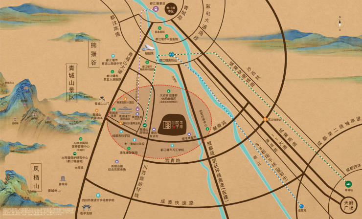 项目坐享青城山麓卓越地段,成都第三绕城高速的建设,将青城山划入”大成都半小时生活圈”。灌高铁e卡通落地,实现高铁公交化。青城山高铁站、都江堰M-TR专线(规划在建中)站线交汇,串联全市配套,构筑便捷城市生活圈。