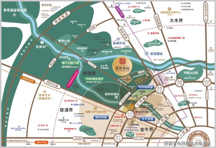 ### 配套——醇熟配套,都会生活- **交通便捷**:项目周边交通网络十分发达,呈现三维立体路网格局。首先,有 2 条地铁环绕。目前已通车的 5 号线皇花园站距离项目仅 1.6 公里,乘坐 5 号线向北可抵达天回镇,往南则能直通高新南区;9 号线 2 期规划的古柏村站距离项目更近,仅 500 米,作为成都的环线轨道,9 号线的重要性不言而喻。其次,还有 5 条公交路线经过,672 路、103 路、24 路、69 路、15 路均在粮油市场站停靠,该站距离项目仅 200 米,出行十分方便快捷。此外,区域内形成了三纵三横的主交通网络,三纵分别是金丰高架、西华大道、北星大道,三横为绕城高速、金芙蓉大道和三环路。其中金丰高架距离项目仅 500 米,通过这些道路,开车约 30 分钟就能到达天府广场,真正实现了离尘不离城的居住理想。- **商业繁华**:项目周边四大商圈环绕,大丰商圈、华侨城商圈、交大商圈、犀浦商圈齐聚,多个大型综合体分布其中,堪称家门口的世界级商圈。开车 15 分钟内,业主均可到达这 4 大成熟商圈。同时,项目自身还配备了 2 万方的蜀绣主题商业街,为业主打造了家门口的全新商业空间,能轻松满足家庭日常消费需求。- **教育优质**:众多名校在项目周边汇聚,能全方位满足 0 - 26 岁的教育需求。与成都七中万达学校距离仅 700 米,金牛外国语学校也只需 10 分钟车程,让业主子女在家门口就能享受到名优教育资源,开启菁英未来。具体学校分布如下:幼儿园有红黄蓝幼儿园、靖地幼儿园、博尔顿幼儿园;小学为西南交大犀浦小学;中学包含金牛外国语学校、树德实验外国语学校、成都七中万达学校;大学有西南交通大学。- **生态宜居**:项目拥有一江四园的生态环境,宛如长在公园里。北面紧邻东风渠滨河绿道,三面被公园环绕,是真正意义上长在公园里的滨河别墅。周边有华侨城欢乐谷、锦城绿道、康城运动公园、晓初滨河公园、蜀绣公园、石犀公园、府河摄影公园等,宜乐宜居。
