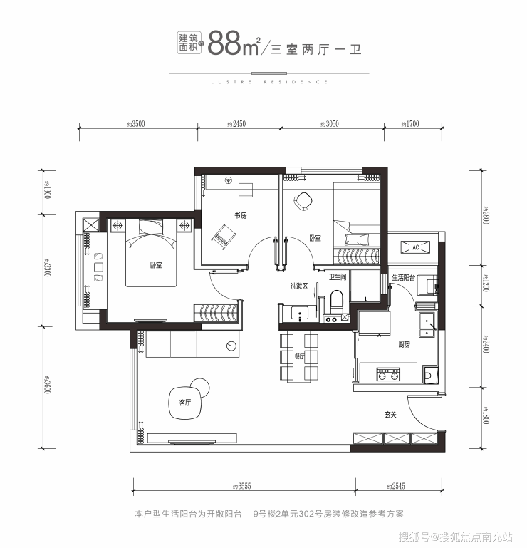 1. 88㎡三室两厅一卫,经典紧凑三房设计,户型方正无浪费,动静分区清晰合理。阳台连通客厅与次卧,采光通风效果良好,空间利用率高,低总价低门槛,是刚需家庭与年轻置业者的优选户型。