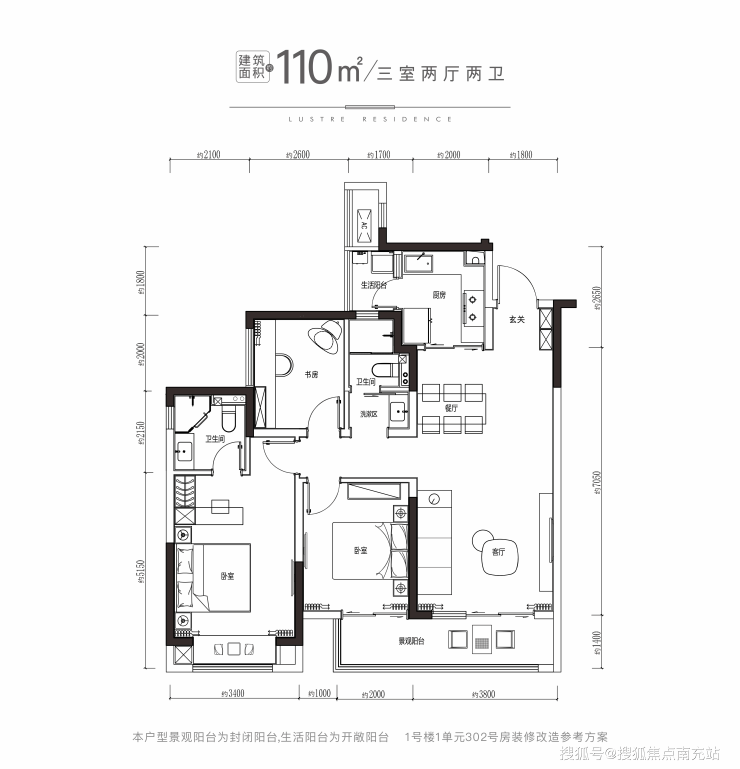 2. 110㎡三室两厅两卫,舒居型三房格局,空间尺度更为宽裕,竖厅设计通透大气,搭配阔景阳台延伸视野。主卧采用套房设计,配备独立卫浴与衣帽间,双卫布局避免早高峰使用冲突,适配三口之家与刚改家庭。