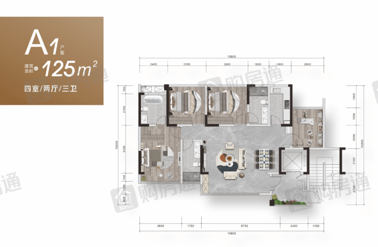 建面约125平套四