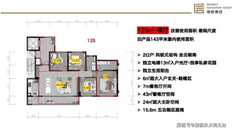 项目以现代艺术风格为设计理念,巧妙运用超现代艺术的弧形线条,搭配流线型的公建化外立面。同时,结合高低错落的建筑形态,构建出多层次的天际线,致力于打造区域内的“地标性建筑”。户型方面:有一款105m²套三双卫户型备受关注。该户型采用横厅设计,属于大三房格局。其得房率高达 107%,套内实得面积约 113m²。这一面积表现,在市场上可与其他产品套内实得面积约 130m²的户型相媲美 。