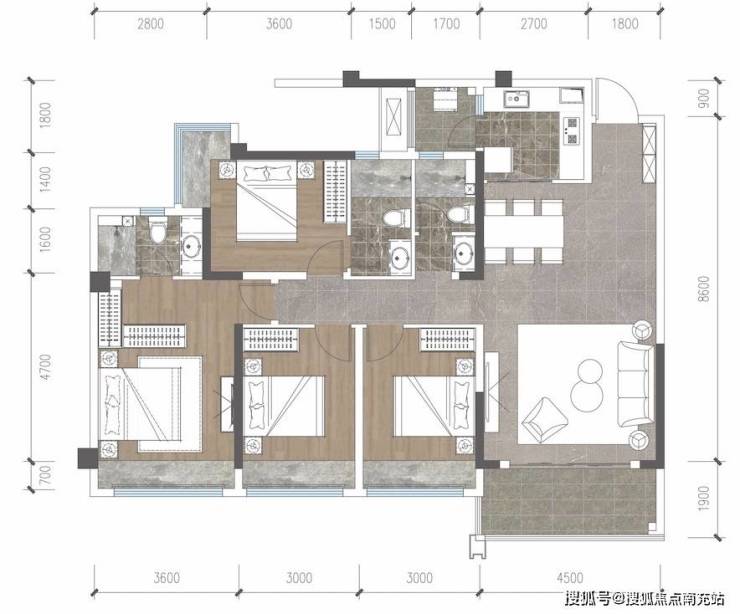 ### 户型鉴赏(户型装修示意图,具体以实际为准)1. **A1户型**:建面约132㎡,三室两厅三卫(双套房)。拥有约5.1米大开间纵厅,让业主能够尽情享受敞亮的空间和美好的时光。三房三卫的尊享配置,双卧均配备衣帽间,充分满足业主的生活需求与品质追求。