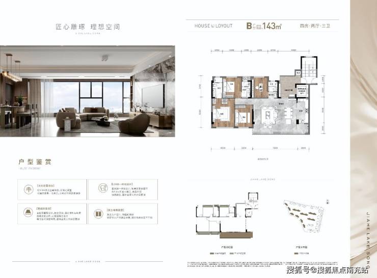 主力143㎡四房户型创新采用"双主卧套房+独立家政间"设计,3.15米层高搭配全景落地窗,实现约110%超高得房率。特别设计的9.8米观景阳台,将500亩怡心湖景引入室内,首创"零公摊"空间体系。
