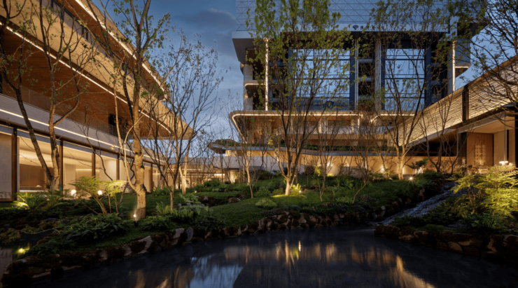 招商玺的园林景观打造充分利用场地本身的坡地地形,打破了平面和室内外的局限,并引入「川西山林」的概念,设计瀑布溪流,置入来自重庆周边山林中带着苔藓的老山石与五角枫、鸡爪槭,再加上叫做「蜀道」的檐下空间,拾级而上,不同标高下,皆有不同的观景体验感。