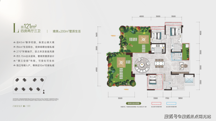 · 建面121㎡(实得200㎡):专属电梯厅,3.15米层高,40㎡私家庭院,三面采光设计