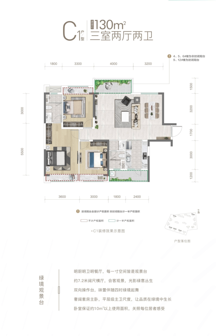 C系列同样是套三双卫户型,面积在129/130㎡左右,也包含横厅与竖厅两种设计。