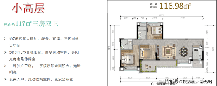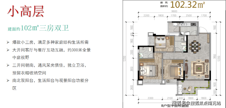 9、创新空间设计:独家采用L型全景阳台,户户实现2/3采光面,97㎡户型更可俯瞰金堂城市全景。