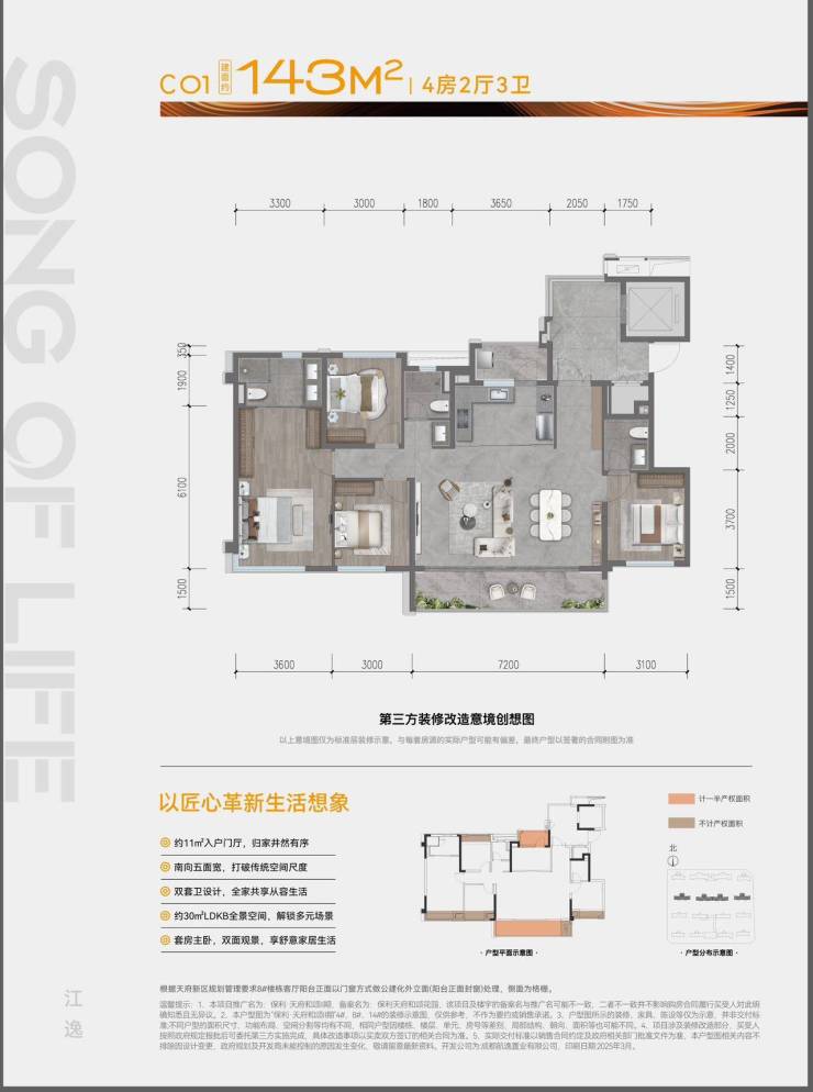 143㎡四房三卫(得房率约 94%):进阶改善标杆,舒适度拉满