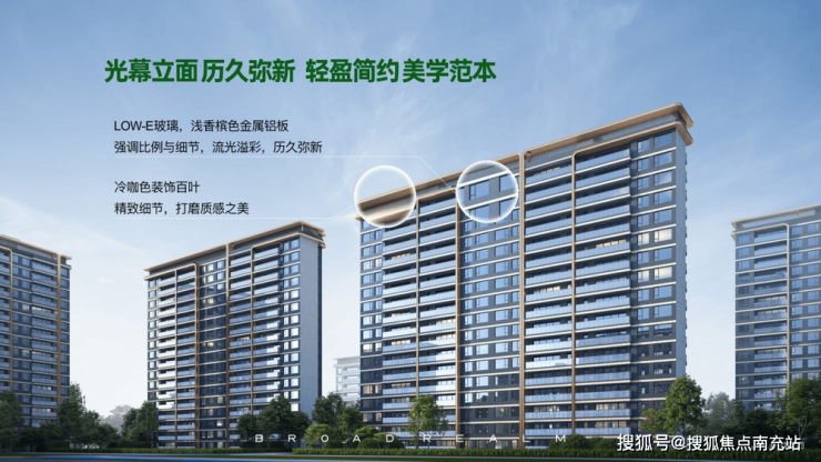 建筑与园林:蓝灰色 LOW-E 玻璃搭配香槟色铝板打造现代光幕立面,内部匠造约 4 万㎡森系园林,含 300㎡中央水景、700 米环形跑道,外邻市政绿地,形成内外双园格局。