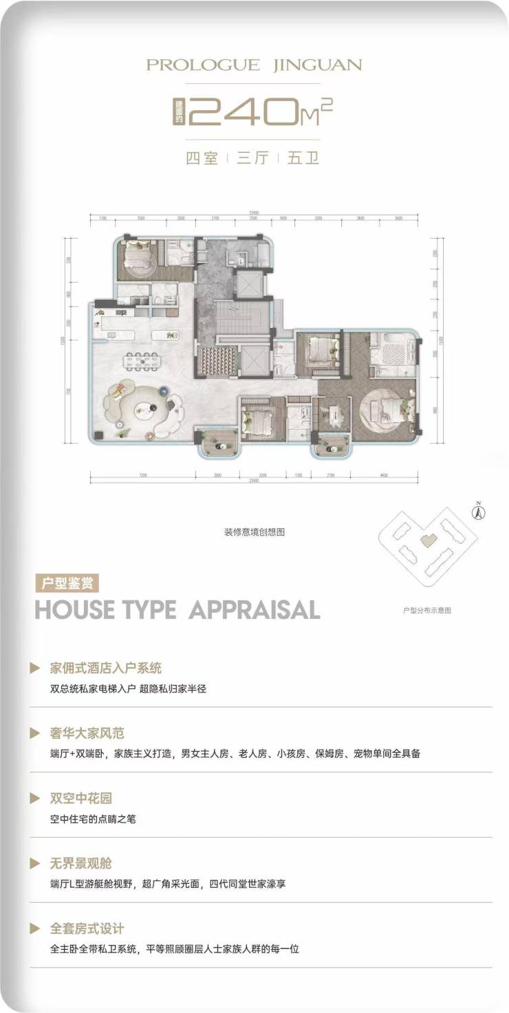 240㎡户型为项目顶奢产品,坐落小区核心楼王位置,一层一户极致私密布局,独立电梯入户,专属保姆间,双归家动线,私密性拉满。空间尺度极致奢华,超大采光面,环幕落地窗设计,尽揽社区园林与城市天际线。全屋多套房规划,总统级主卧配备双衣帽间、独立卫浴与观景露台;奢阔横厅格局,衔接超大空中花园,室内外景观自然交融。独立家政间、多功能储藏空间与专属会所,超强收纳能力与社交空间,平衡顶奢居住品质与日常居家实用性,匹配城市塔尖人群居住标准。