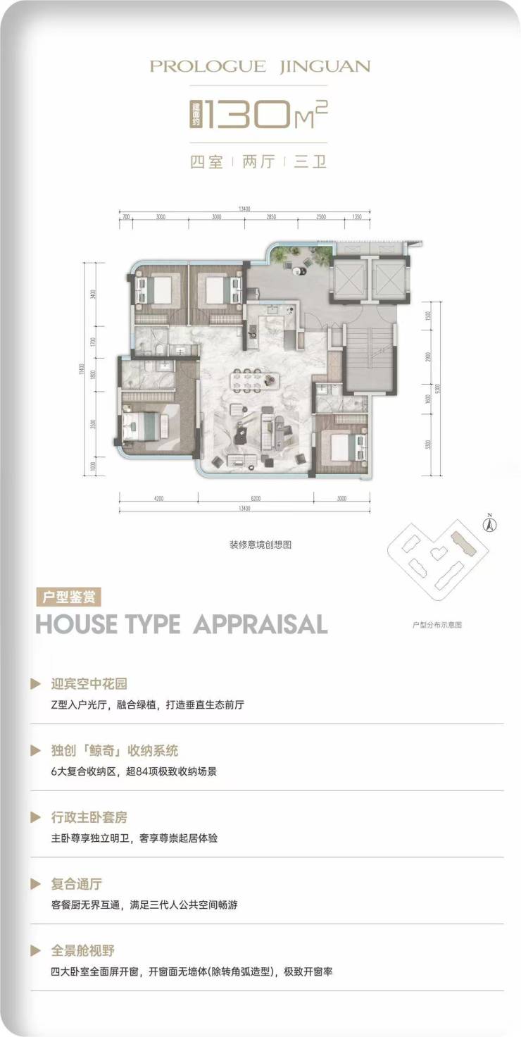 130㎡户型为项目入门级改善产品,纯板式南北通透格局,2梯2户设计,独立入户,私密性佳。全屋得房率近100%,空间零浪费,规划奢阔四房三卫,动静分区合理。约6.2米开间方厅,超40㎡家庭社交空间,衔接景观阳台,采光通透。主卧尊享套房式布局,搭配独立卫浴与专属收纳空间,双次卧开间均达约3米,适配三口之家或进阶改善家庭居住需求。