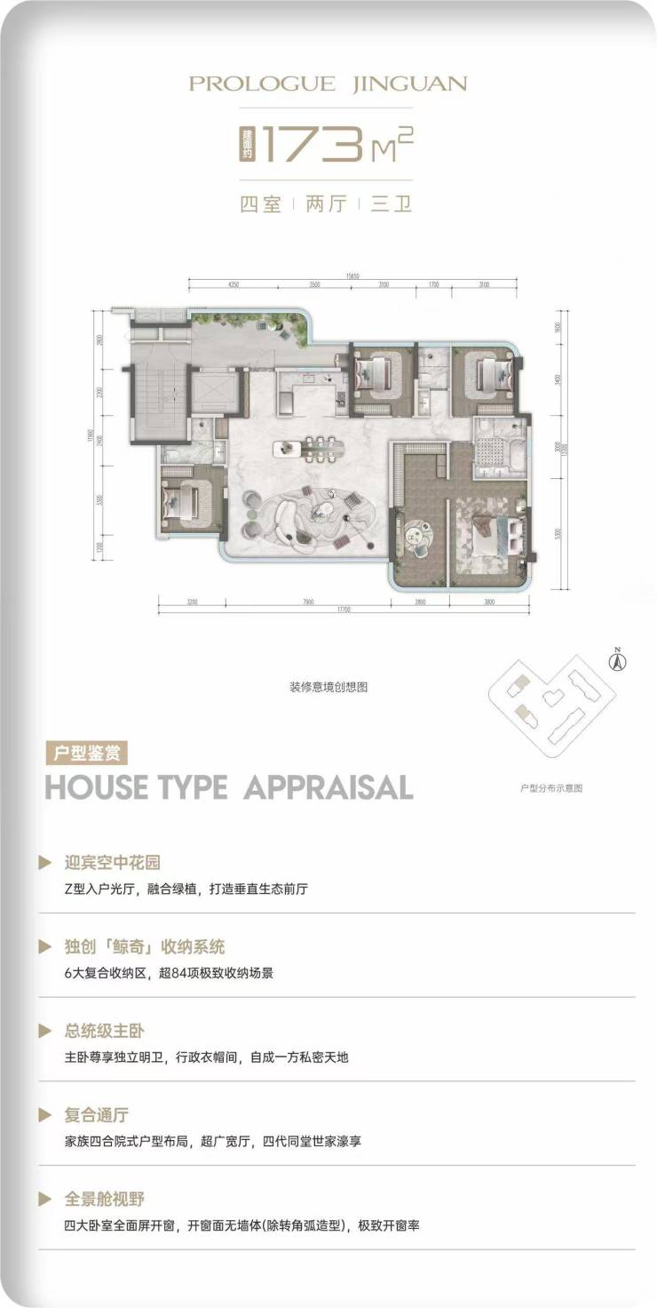 173㎡户型为高阶改善产品,2梯1户私密布局,双归家动线,专属入户厅,私密性与仪式感拉满。纯板式南北通透格局,超大采光面,全景落地窗设计,室内通透明亮,视野无遮挡。户型规划奢阔四房三卫,多套房布局,每一处休憩空间都兼顾私密与舒适。客餐厅开阔舒展,衔接空中花园,室内外景观自然交融;独立多功能空间,可打造私人会所或书房,匹配城市高净值人群生活格调。