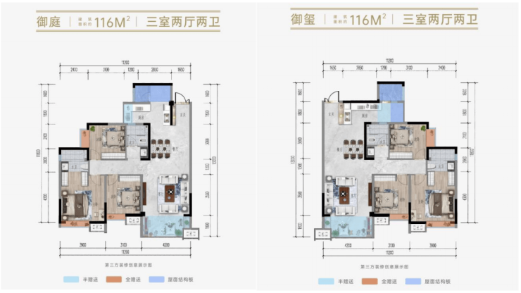 116㎡户型呈现出三室两厅双卫的布局。值得一提的是,其拥有约 12㎡的赠送面积,相当可观,赠送后实际可得面积约达 129㎡。此户型运用了经典的竖厅设计,入户门配备外开门子母门。这种独特的子母门设计,一方面极大程度增强了居住过程中的安全保障,另一方面也能切实有效地维护业主的隐私,为业主营造一个安心、私密的居住环境 。