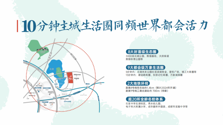 生态:3000亩北湖公园、熊猫基地、天府绿道、熊猫体育公园